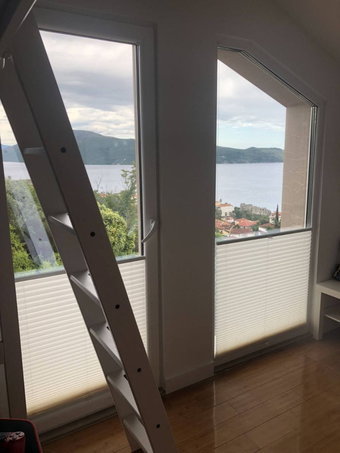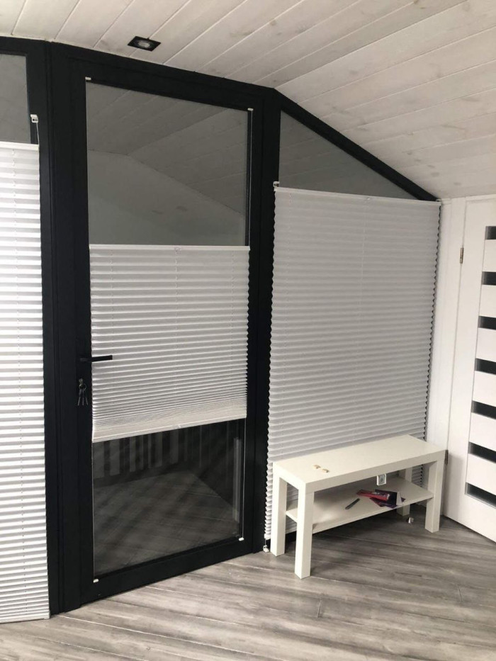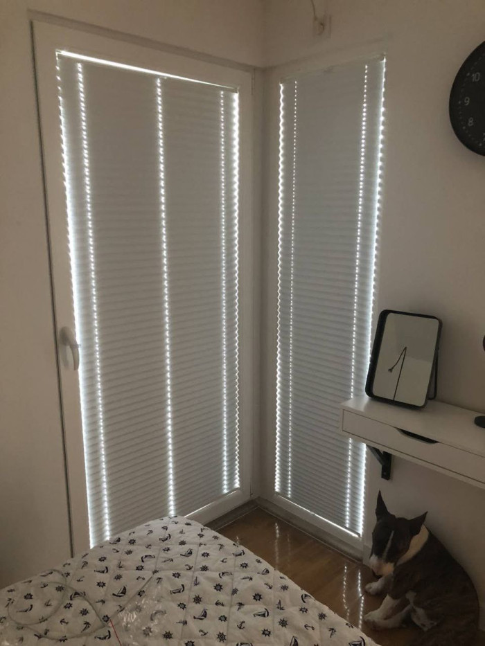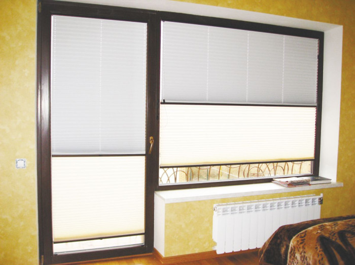 - Подвійні жалюзі плісе — чудовий варіант закрити стандартне вертикальне вікно двома тканинами з різним ступенем затемнення або візерунком і обирати, яку сторону використовувати в даний час доби.